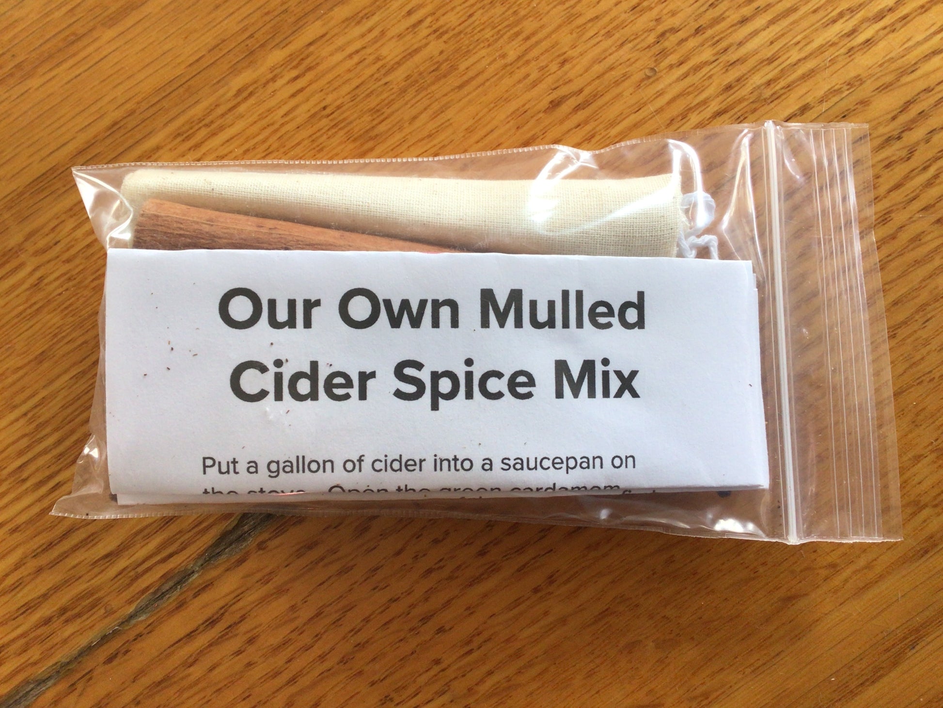 Our own hearty spice mixture. Sized just right for a gallon of warm apple cider or bottle of wine, and comes with our own farm recipe. Made with cinnamon sticks, crystallized ginger, allspice berries, star anise, whole cloves